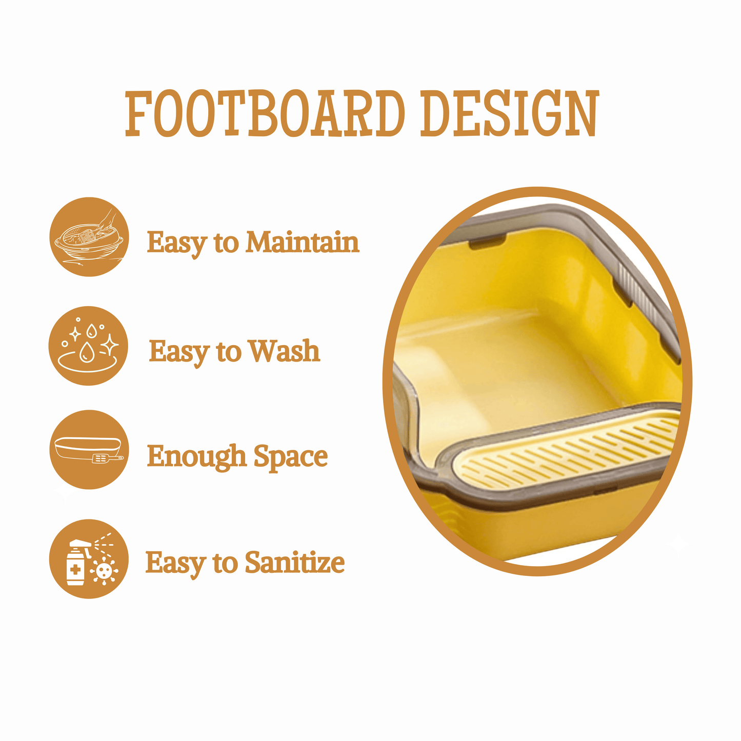Candy Yellow Cat Litter tray with a large open design for easy access and air circulation. Features a high edge to prevent spills and a cut-out pattern pedal to reduce litter tracking. Comes with a scooper for hassle-free cleaning (Color May Vary).