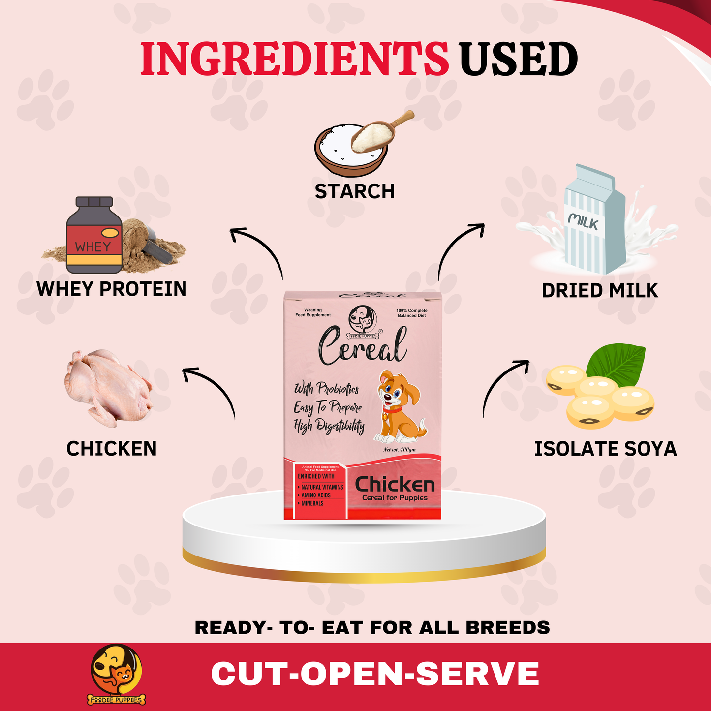 Chicken Cereal is a balanced diet for newborn puppies, enriched with probiotics, vitamins, and minerals. It supports immunity, growth, shiny coats, strong bones, and is gentle on sensitive stomachs with a delicious chicken flavor.