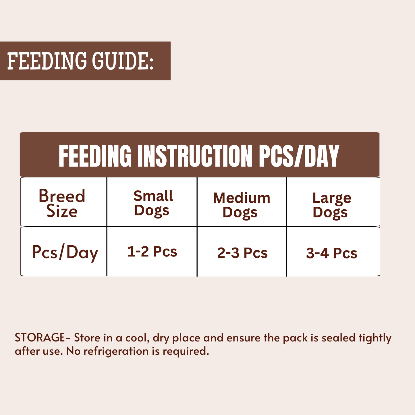 - Feeding Guide (pieces per day): Feed 1-2 pieces for small dog, 2-3 pieces for medium dogs and 3-4 pieces for large dogs.