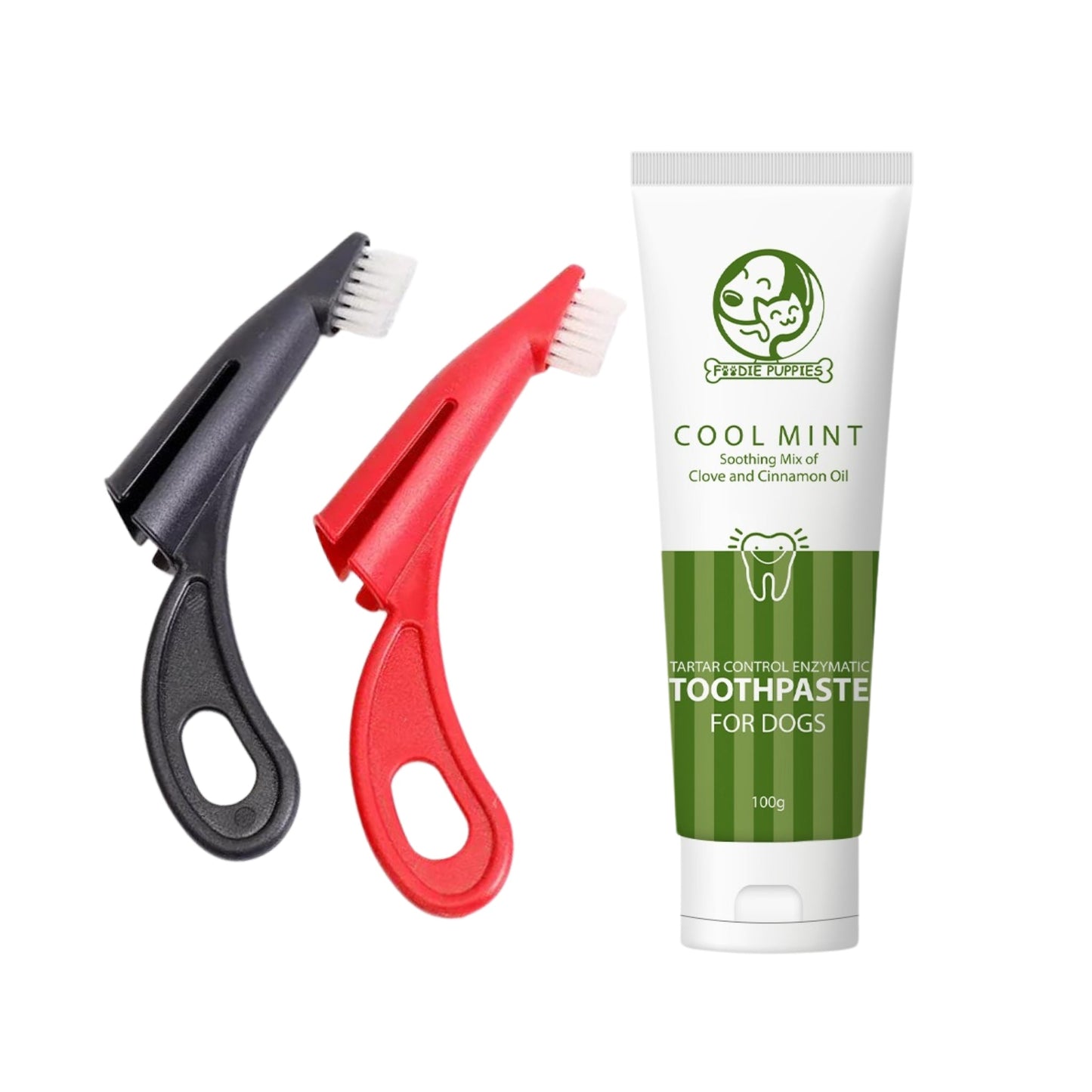 Foodie Puppies' enzymatic toothpaste for dogs helps in reducing plaque and tartar buildup. Freshens breath brightens teeth and supports the overall dental hygiene of your pet. Plastic toothbrush on your fingers to avoid being bitten. Flexible dog & cat toothbrush (to reach back teeth), soft bristles, and tapered heads.