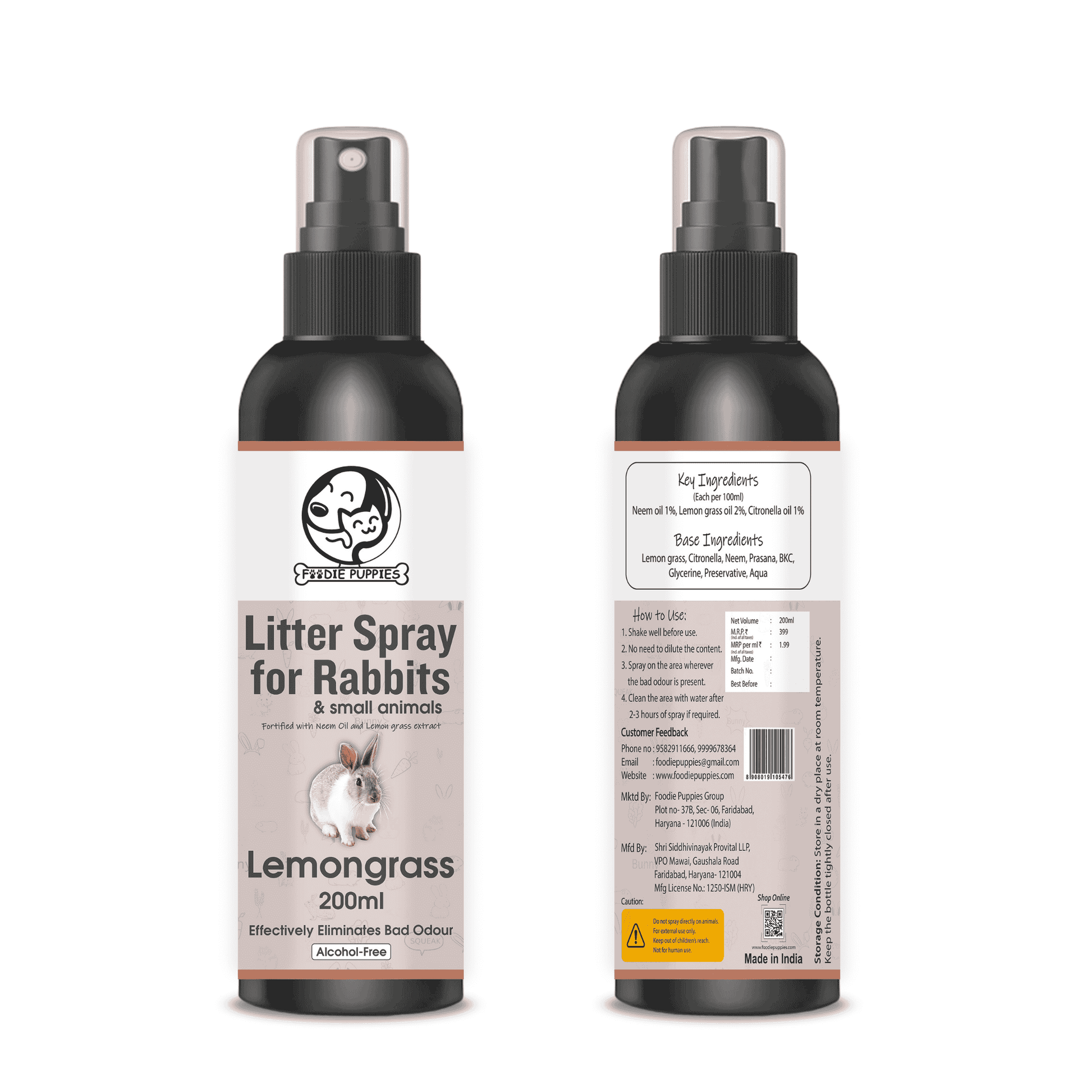 Foodie Puppies litter spray for rabbits & small animals. Fortified with neem oil and lemon grass extract. rabbit litter spray removes litter odor in cages. it acts as a freshener for your rabbit and rabbit-like lemon grass fragrance. Spray 6-7 sprays in the rabbit cage and around it after cleaning as per smell and size of the cage.