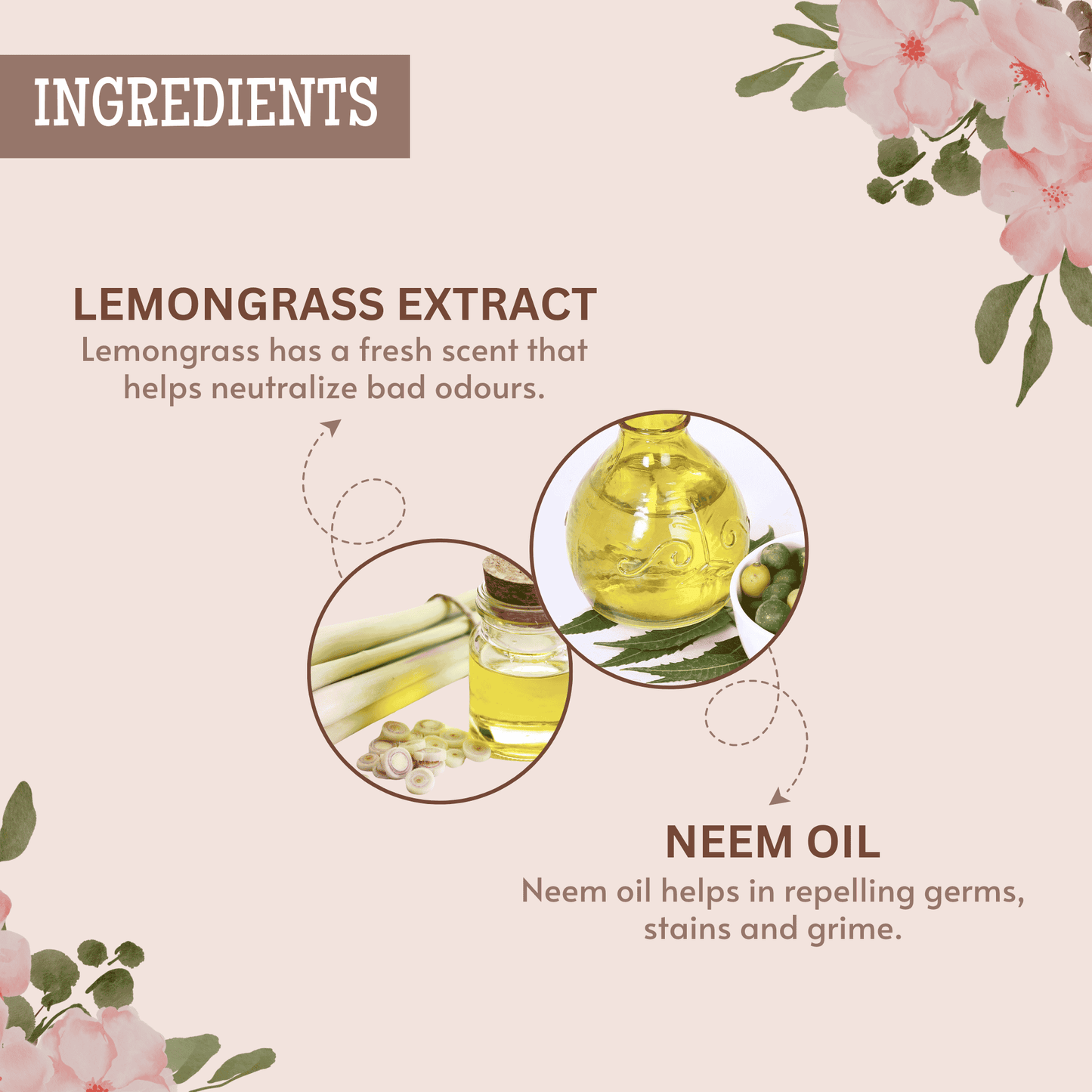 Neem oil 1%, Lemon Grass oil 2%, Citronella oil 1%