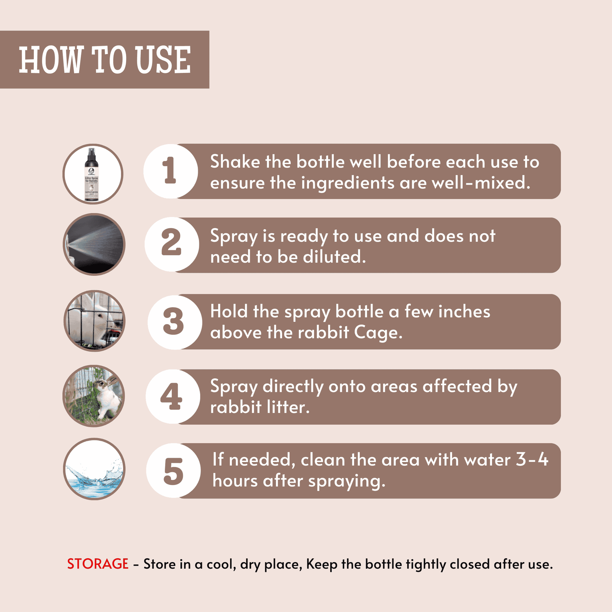 - Spray on the areas where rabbit litter is present.
