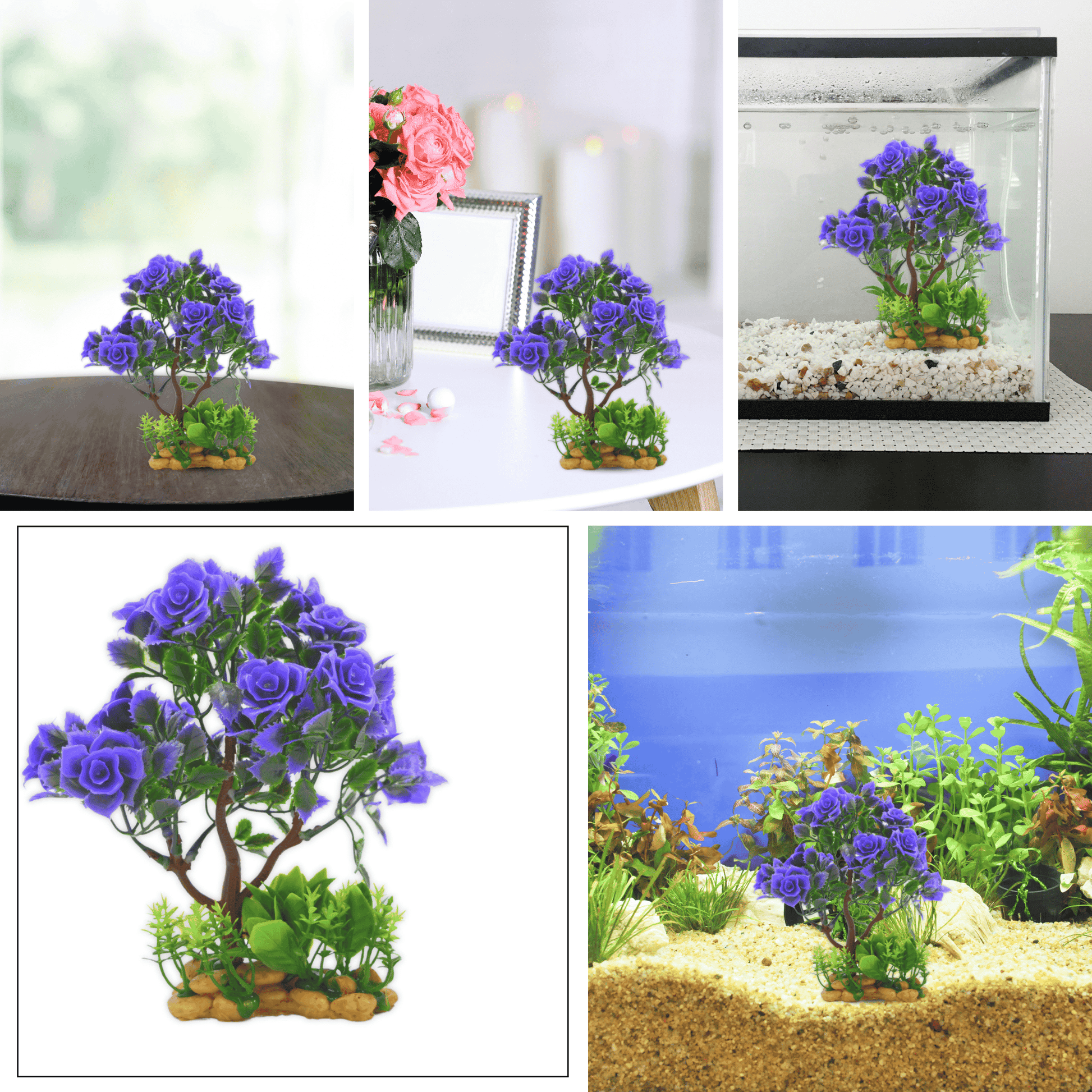 Natural-looking artificial purple rose plant with a sturdy resin base, perfect for adding color and beauty to fish tanks, homes, or offices. Easy to install and safe for aquatic life.